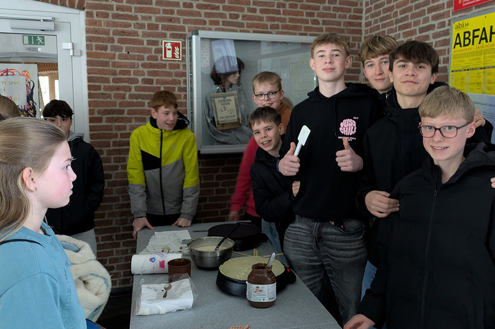 Zur großen Freude vieler Schüler (und auch Lehrer!) hat der Französischkurs der 8a sehr leckere Crêpes verkauft, die Schlangen in den Pausen waren lang. Der Erlös geht an das Hilfsprojekt unserer ehemaligen indischen Schwestern, konkret wird mit dem Geld indischen Mädchen aus finanziell schwachen Verhältnissen der Schulbesuch ermöglicht. Herzlichen Dank an den Französischkurs für das tolle Engagement!