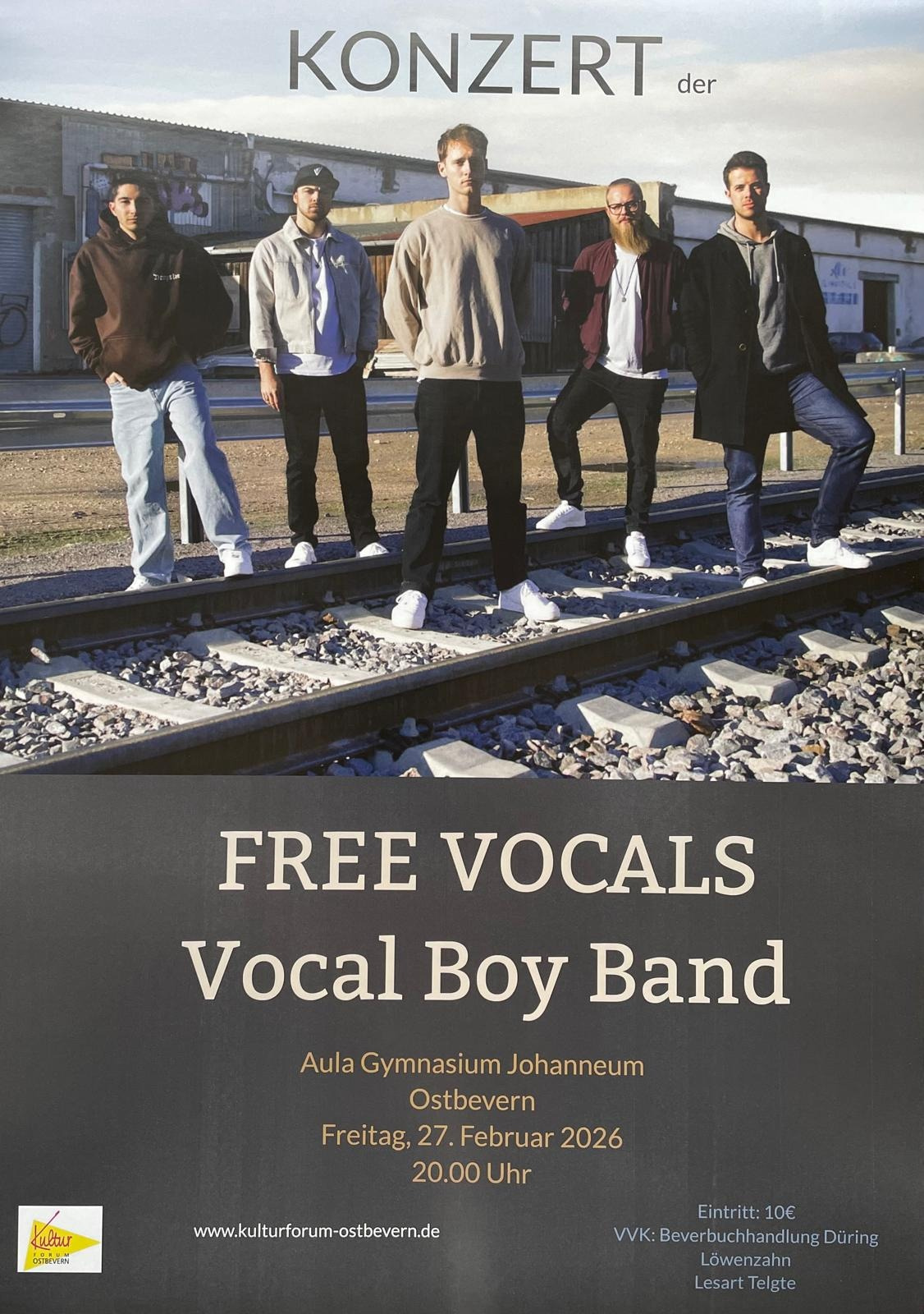 Das Kulturforum Ostbevern e.V. präsentiert diese ungewöhnliche Vocal Boy Band in einem A-Capella-Konzert am Freitag, den 27. Februar 2026 um 20.00 Uhr in der Aula des Gymnasium Johanneum (Loburg) in Ostbevern. Der Eintritt ist mit 10,- € bewußt niedrig gehalten, damit auch viele Jugendliche die Möglichkeit bekommen, dieses außergewöhnliche Konzert mitzuerleben. Hörproben sind unter www.freevocals.de aufzurufen. Karten gibt es an den bekannten Vorverkaufsstellen in der Beverbuchhandlung Düring, bei Löwenzahn und dem LWL Büro Cramer in Ostbevern. In Telgte können die Karten in der Buchhandlung Lesart erworben werden.