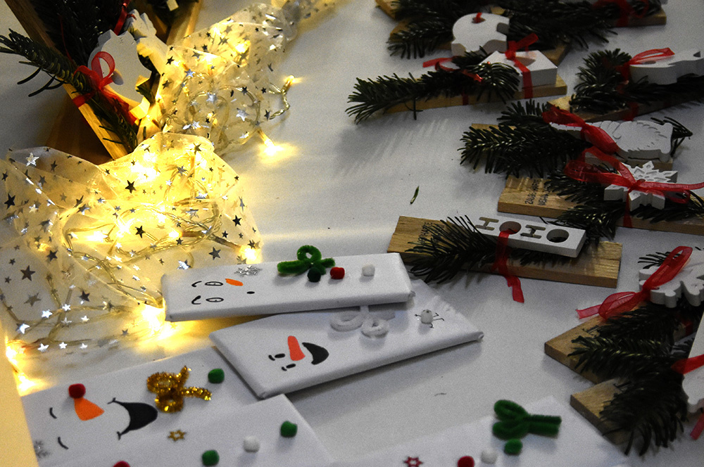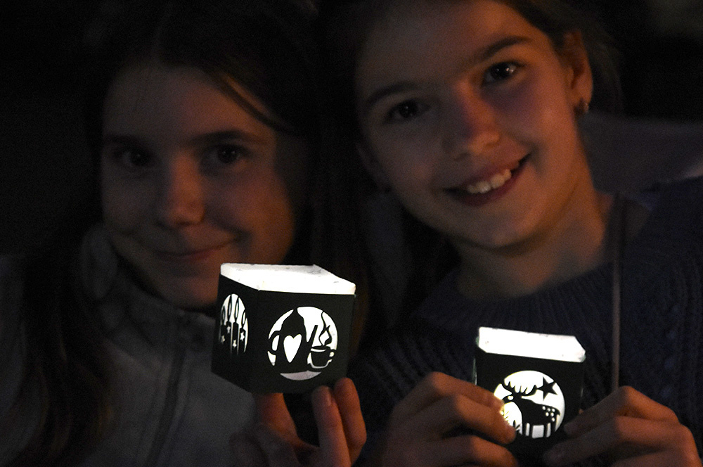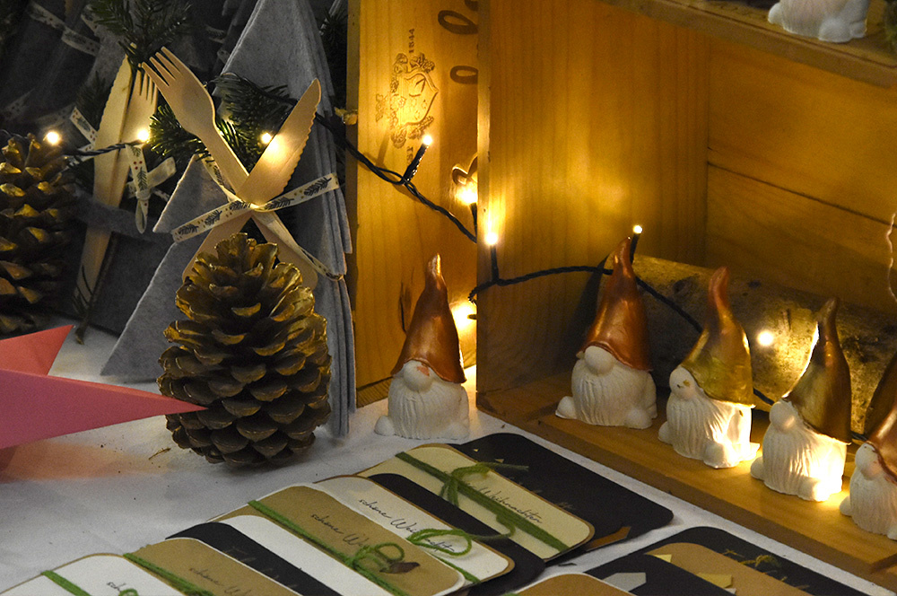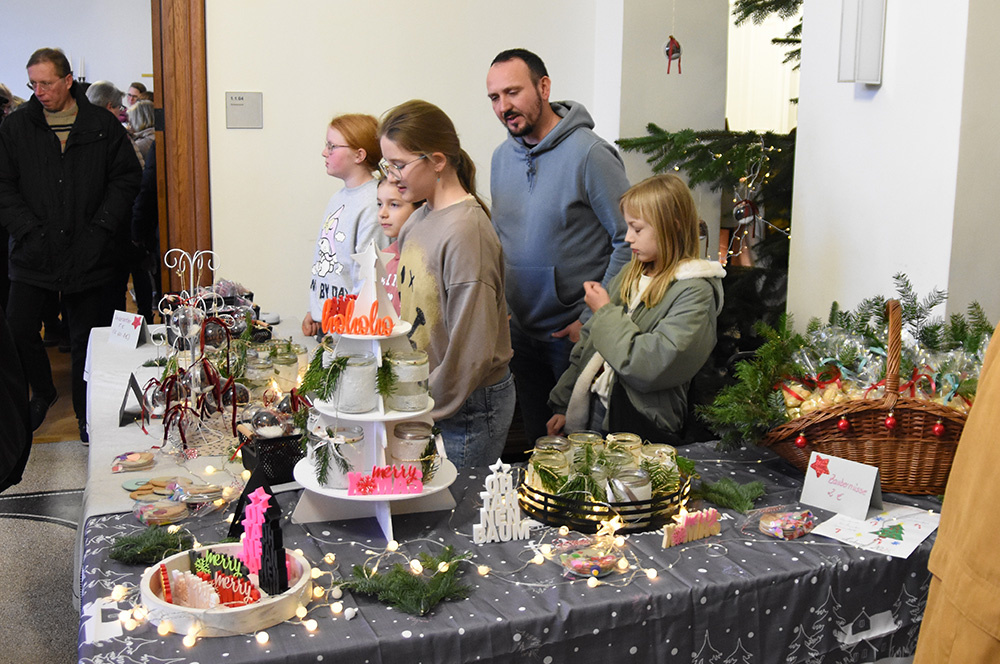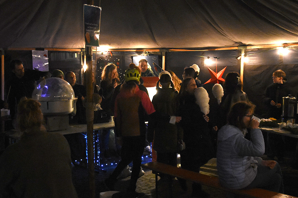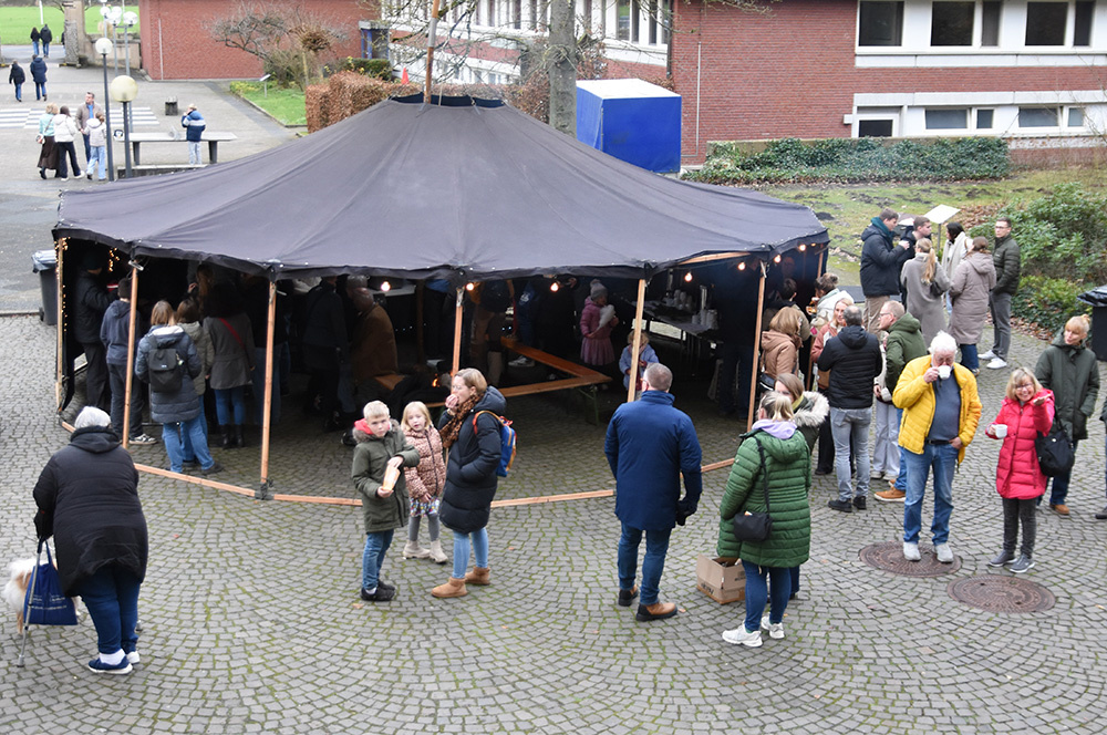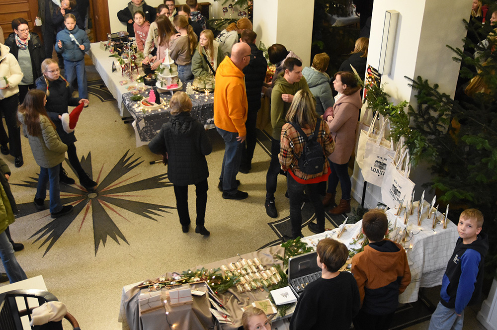 Im Schloss eröffnete sich den Besuchern anschließend das bunte Panorama des Adventsbasars: Kreative Basteleien wie Karten, Adventskalender, Teelichthalter, köstliches Selbstgebackenes, praktische Weihnachtsgeschenke wie Lesekissen und Taschen, Vogelhäuschen und Meisenknödelhalter aus Weiden – wie immer hatten Eltern und Kinder Arbeit und Herzblut investiert, um das Angebot attraktiv zu gestalten. Auch für das leibliche Wohl war gesorgt: In der Cafeteria konnte man sich mit Torten und Kuchen stärken, während draußen vor dem Schloss in der Jurte Glühwein, Kakao, Punsch, Popcorn, Zuckerwatte und Waffeln angeboten wurden. Die heimelige Stimmung hier lud besonders zum Verweilen und "Klönen" ein.