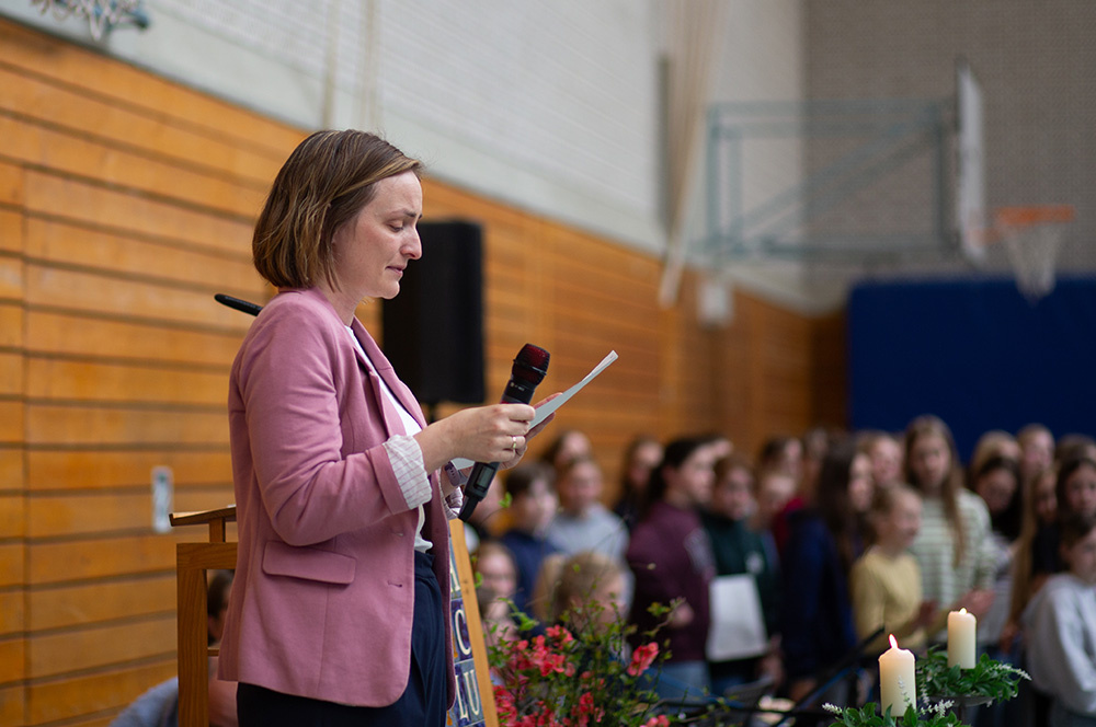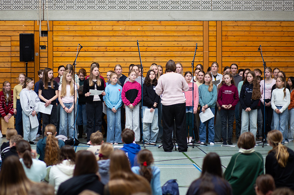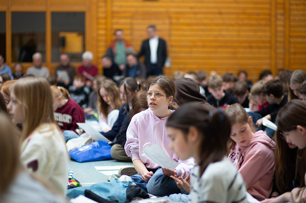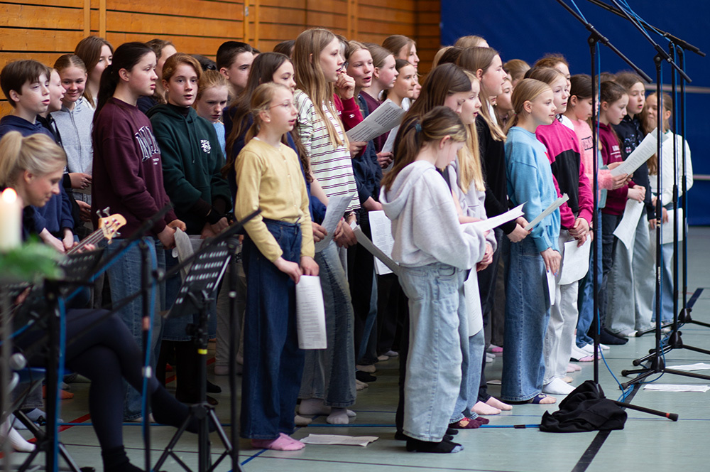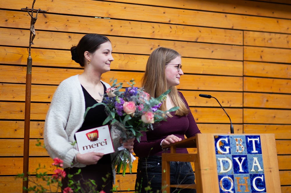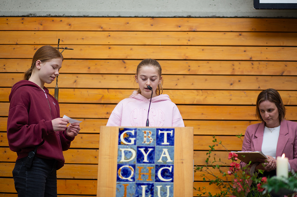 Im Mittelpunkt des Gottesdienstes stand die Frage, ob die Botschaft von Jesu` Auferstehung schon im Leben eine Rolle spielen kann. Was es bedeuten würde, ein „Auferstehungsmensch“ zu sein, zeigten Schülerinnen der Vorbereitungsgruppe rund um Franzis Niehoff in einer kurzen Schauspielszene. Die Botschaft lautete, dass wir einander bei Krisen oder Problemen unterstützen sollten, dass wir uns aufeinander verlassen müssen, damit wir immer wieder aufstehen können. Das vom Jugendchor gesungene „Count on me“ erzählt von diesem tröstlichen Gedanken.