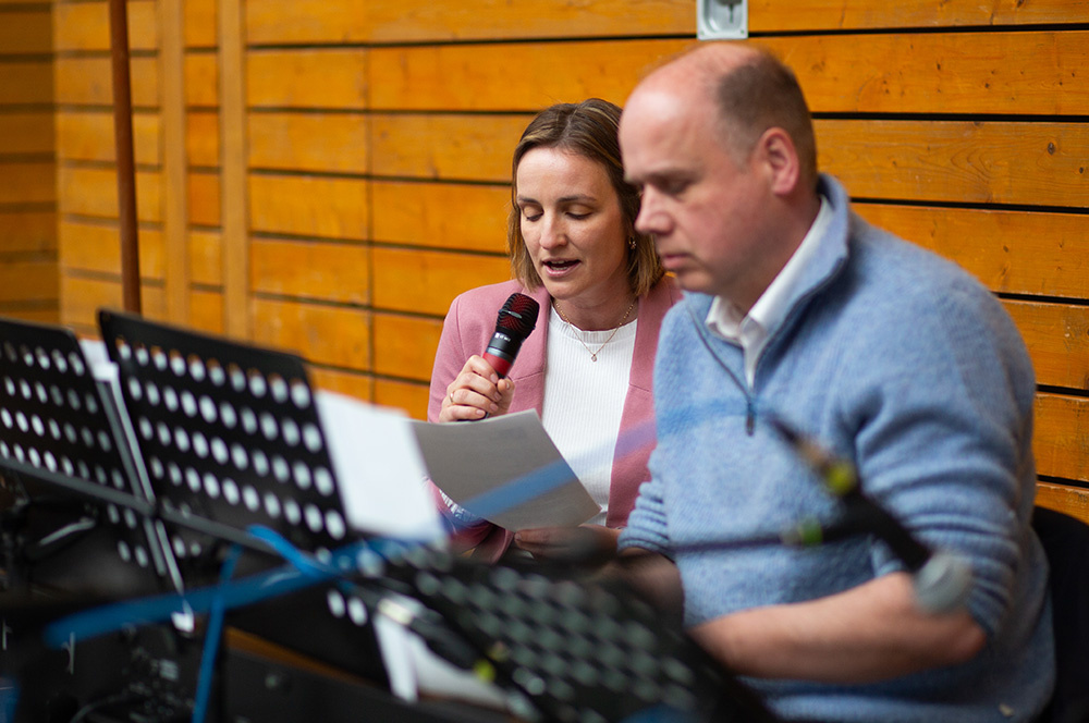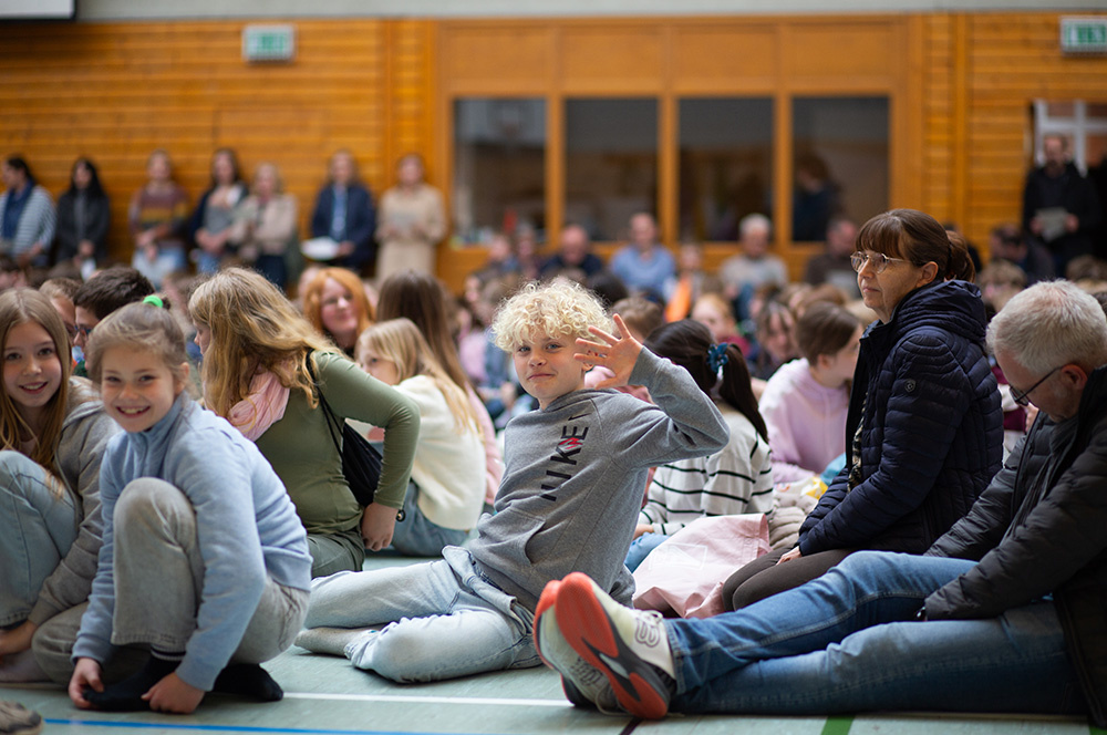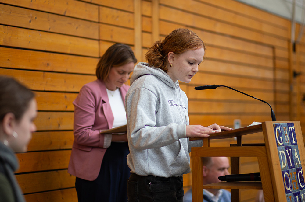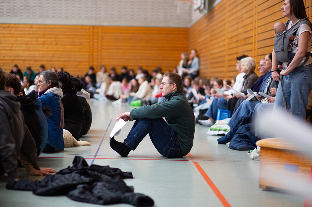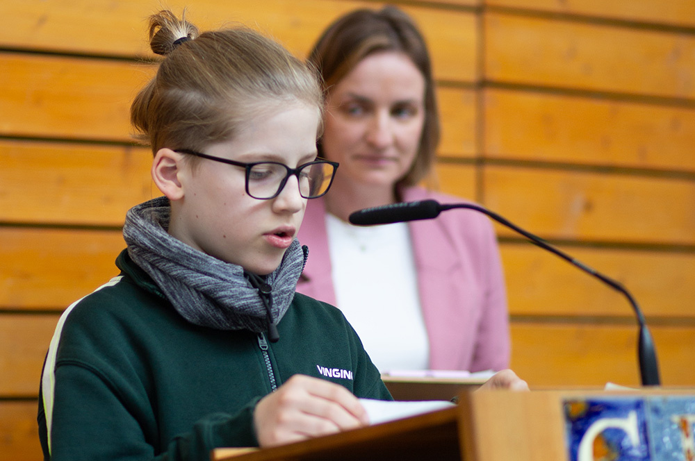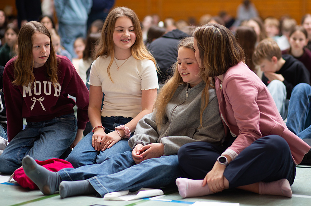 Im Mittelpunkt des Gottesdienstes stand die Frage, ob die Botschaft von Jesu` Auferstehung schon im Leben eine Rolle spielen kann. Was es bedeuten würde, ein „Auferstehungsmensch“ zu sein, zeigten Schülerinnen der Vorbereitungsgruppe rund um Franzis Niehoff in einer kurzen Schauspielszene. Die Botschaft lautete, dass wir einander bei Krisen oder Problemen unterstützen sollten, dass wir uns aufeinander verlassen müssen, damit wir immer wieder aufstehen können. Das vom Jugendchor gesungene „Count on me“ erzählt von diesem tröstlichen Gedanken.