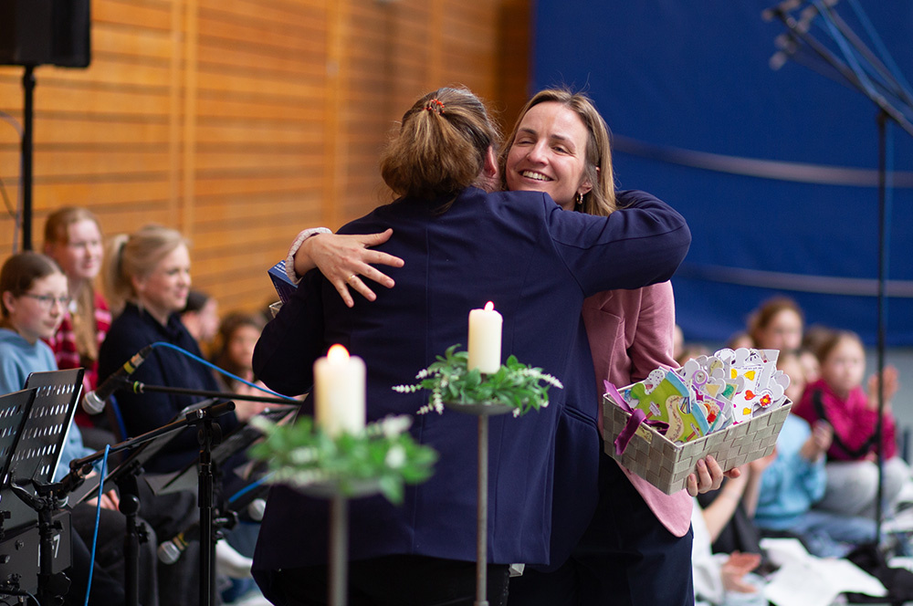 Schulleiterin Dr. Anja Stiglic fasste Franzis Niehoffs Wirken zusammen, indem sie ihr Tränentrocknen, ihre Problemlösungen, ihre Empathie betonte. Auch stellte Stiglic dar, inwiefern sie besonders geeignet für eine Promotion in der Theologie sei, worin ihre nächste berufliche Etappe bestehen wird. Sie würde in ihrer Arbeit Wissenschaft mit Wärme, Herz und Hand verbinden, in Wundern, die man nicht postet, in kleinen Gesten, die man nicht zählt, in Wertschätzung und Liebe für die Mitmenschen- insofern habe sie den Doktortitel eigentlich längst in der Tasche. Für diese nächste Aufgabe wünschte Frau Stiglic ihr Gottes Segen.