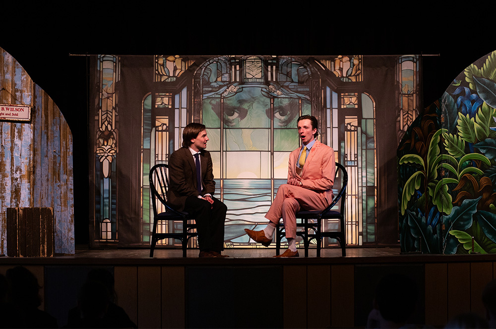 Eine wiederum vollkommen andere Geschichte bildete den Abschluss dieses langen, für das Ensemble außerordentlich fordernden Theatertages: The Great Gatsby. Dieser Klassiker der modernen amerikanischen Erzählliteratur, 1925 erstmals veröffentlicht und von Peter Griffith für die Bühne bearbeitet, handelt von den verzweifelten Bemühungen eines geheimnisumwitterten Millionärs, dessen Jugendliebe Daisy Buchanan zurückzugewinnen. So wie Jay Gatsby am Ende, ungeachtet seines Reichtums und seiner illustren, allseits beliebten Partys, tragisch scheitert, so lässt sich die nach ihm benannte Geschichte insgesamt als zutiefst bewegender Abgesang auf den amerikanischen Traum deuten. Die komplexe Handlung des von F. Scott Fitzgerald verfassten Romans in knapp 90 Minuten auf die Bühne zu bringen, stellt eine dramaturgische und schauspielerische Herausforderung dar. Diese vermochte das Ensemble souverän zu meistern, auch wenn es aufgrund mancher Doppelrollen nicht immer einfach war, der Handlung zu folgen. Inzwischen ist die Bühne leergeräumt, das Ensemble ist wieder unterwegs, um an anderen Schulen in ganz NRW und weit darüber hinaus zu spielen. Für die Loburg bleibt nach diesem Gastspiel festzuhalten: See you next year, White Horse Theatre!