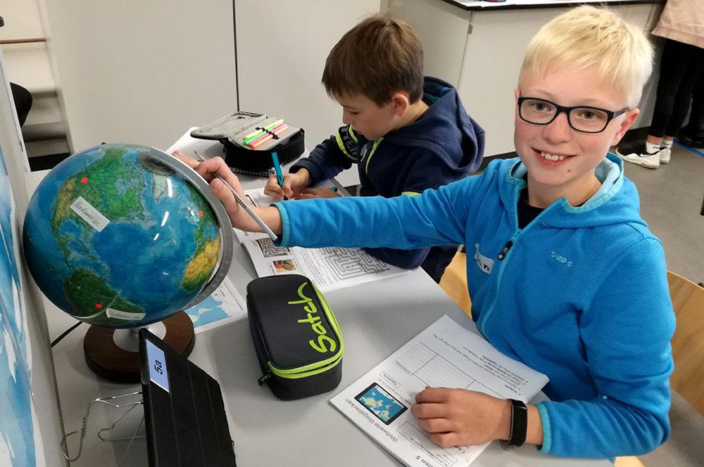 Kaum angekommen im PhänomexX in Ahlen, starteten die SchülerInnen in Teams mit ihrem Forscherheft und eroberten sich die unterschiedlichen Themenwelten: Entfernungen abschätzen wie eine Fledermaus per Echolot, optische Täuschungen im Ames-Zimmer erleben, Fossilien datieren, Sägerochen erforschen, Eisberge zum Schmelzen bringen, Kugelbahnen ausprobieren, Goldbarren wiegen, Diamanten schätzen, die Höhe des Eiffelturms bestimmen , Modellautos mit einem echten Ferrari vergleichen, die Zeitzonen der Erde entdecken, Herrn Celsius im Theaterstück spielen, Fliegen und Honigbienen untersuchen, wie ein Bussard sehen, Wege aus Labyrinthen finden und noch vieles mehr.