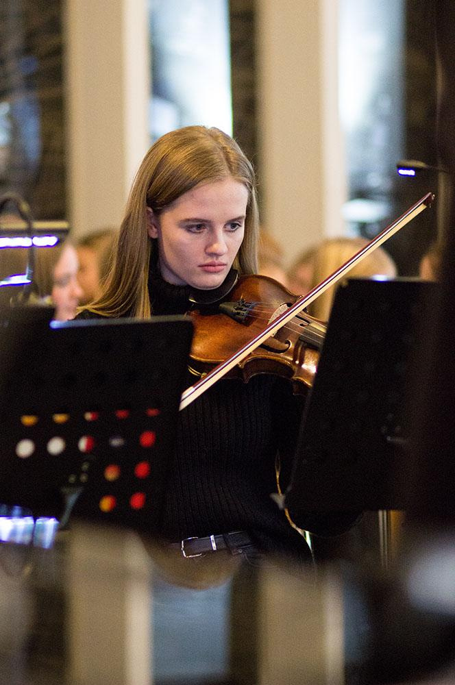 Im Namen der Stufe Q2 lud Pia Timm die Konzertbesucher ein, zum geselligen Ausklang überzugehen, und in der Pausenhalle auf einen Glühwein, Kinderpunsch oder Plätzchen vorbeizukommen.