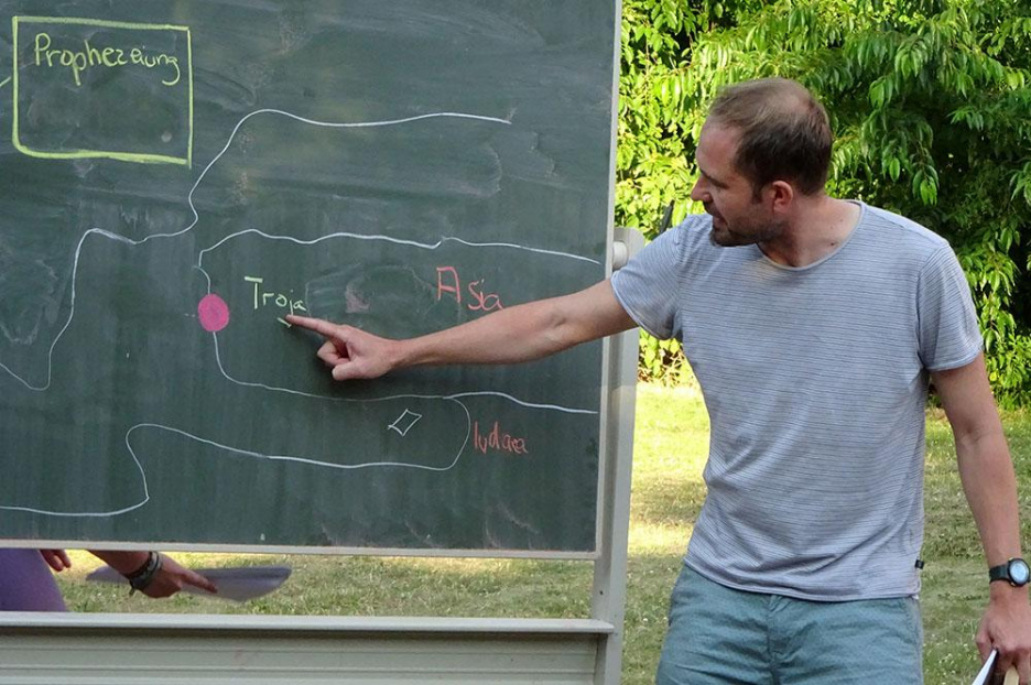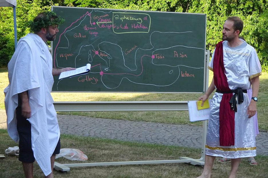 Auch die Fachschaft Latein hatte sich zur Verabschiedung ihres langjährigen Fachvorsitzenden etwas einfallen lassen. Thorsten Wanke und Tobias Demmer brachten in spielerischer Form Wichtiges aus der Loburger Zeit von Ulrich Beuckmann zur Sprache. Vor einigen Tagen sei beim Legen neuer Kabel an der Loburg eine neue Version von Vergils Aeneis gefunden worden – Thorsten Wanke und Tobias Demmer übernahmen nun die Rollen von Aeneas und Anchises und zitierten aus der sogenannten „Heldenschau“, im Versmaß des Hexameter, allerdings mit Rücksicht auf die Zuhörer/innen in deutscher und nicht in lateinischer Sprache. Erwähnt wurden nun die „Heldentaten“ des Dr. Ulrich Beuckmann – u. a. die hohe Zahl der Korrekturen, die er jahrelang zu bewältigen hatte, die Kurstreffen mit den Leistungskursschülern, an die beide ebenso persönliche Erinnerungen hatten wie an die bereits erwähnten Romfahrten. Zuletzt bedankte sich Josef Bisping mit einigen Worten im Namen der Fachschaft noch einmal für alles, was Ulrich Beuckmann in den letzten Jahrzehnten geleistet hatte. Als Geschenk überreichte die Fachschaft ihm ein neues Trikot für seine zweite Leidenschaft, das Radrennfahren.