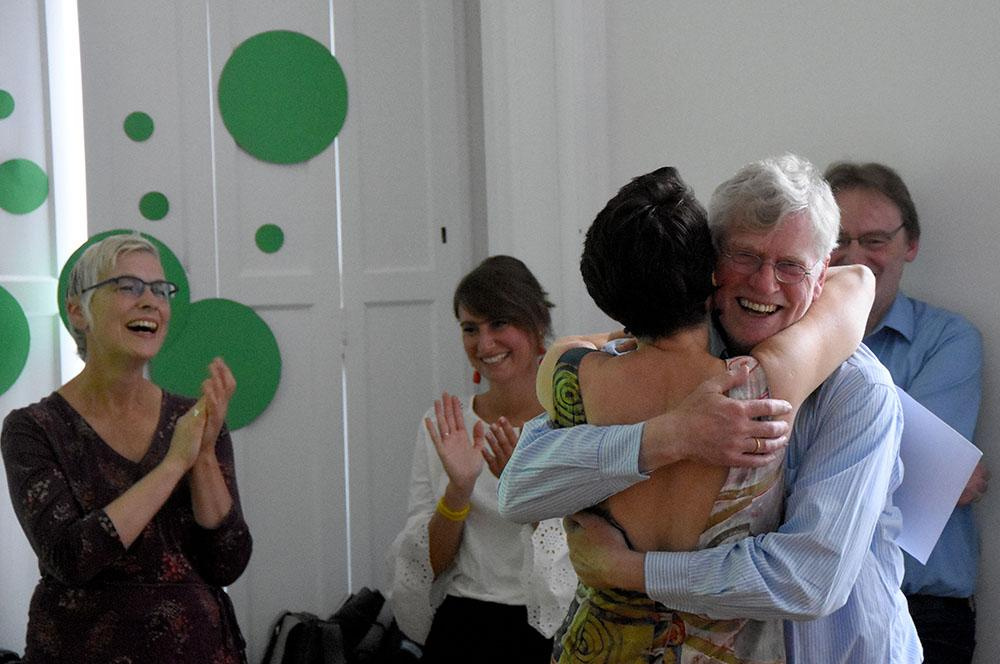 Die Künstler hatten ein Quiz vorbereitet, das Ulli mit Hilfe des Kollegiums mühelos bewältigte. Mit beeindruckenden persönlichen und emotionalen Erzählungen erinnerten sie an einen Pädagogen mit ungewöhnlichen Ideen und Methoden. Bei der künstlerischen Gestaltung der Loburg hat Ulli wohl am nachhaltigsten gewirkt. Zahllose Kunstwerke im Innen- und Außenbereich werden wohl noch Jahrzehnte das Bild der Loburg prägen. Sein bekanntestes Werk ist wohl das „kaputte Auto“ (so der Wortlaut eines Schülers), das schon in zahlreichen Publikationen über das Münsterland besprochen wurde.