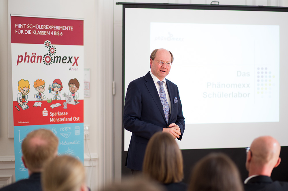 Dazu lud die Schule neben VertreterInnen aus der Eltern- und aus der Schülerschaft auch externe Gäste ein. So versammelten sich auch Vertreter der Sparkasse, die als Sponsor auftritt, Landrat Dr. Olaf Gericke, der Ostbeveraner Bürgermeister Karl Piochowiak und zwei Mitarbeiter des PhänomexX Ahlen, Herr Reinhardt Böhm und Frau Anna Weber im Rittersaal des Schlosses.