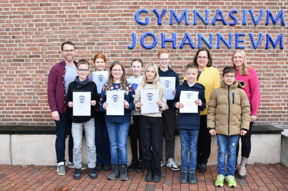 Lena Pelke, Luzie Niemerg, Romy-Zara Mittelstedt, Silas Höpke, Leif Grünkemeyer, Marten Pries, Julius Nuyken und Lisa Buckebrede aus der Jahrgangsstufe 5 erzielten einen dritten Platz. In der Jahrgangsstufe 6 konnten sich Thea Schulte im Rodde, Liana Schlee und Dana Vosskötter über einen dritten Platz freuen. Über einen zweiten Preis freuten sich Moritz Otte (Jahrgangsstufe 5) und Hanna Everwin (Jahrgangsstufe 6). Herausragende erste Plätze belegten Kirsten Akamp und Philipp Bissky aus der Jahrgangsstufe 5. In der Jahrgangsstufe 6 konnten sich Ruben Luppe und Marie Keuchel über den ersten Platz freuen. Außerdem wurde Marie Keuchel für den weitesten „Kängurusprung“ geehrt.