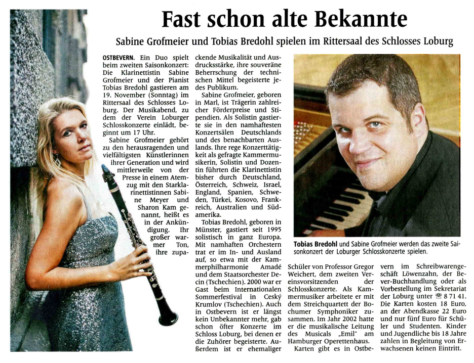 Fräulein Klarinette singt im Rittersaal / Sabine Grofmeier und Tobias Bredohl zu Gast auf der Loburg