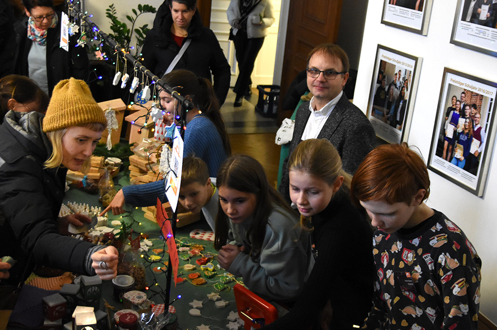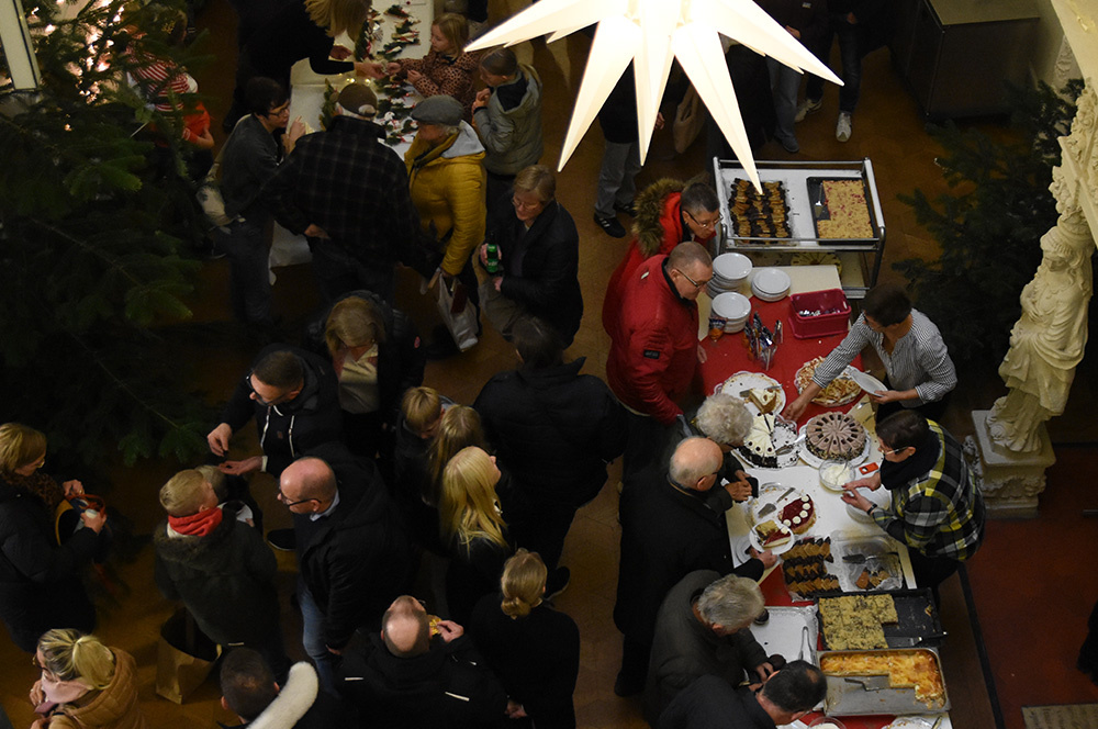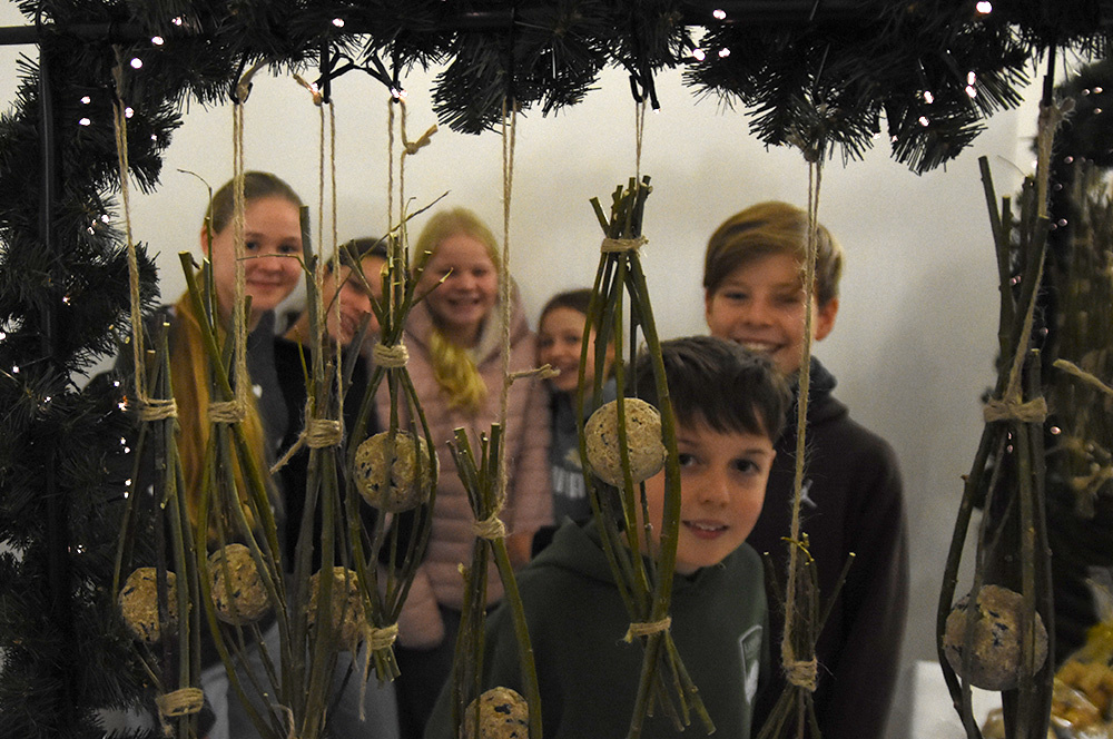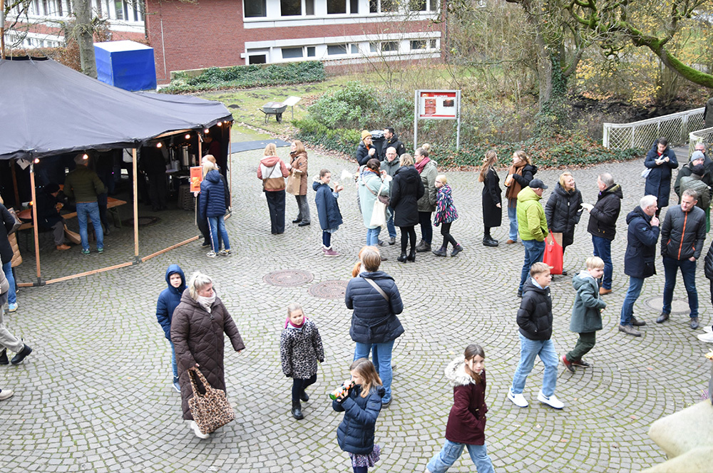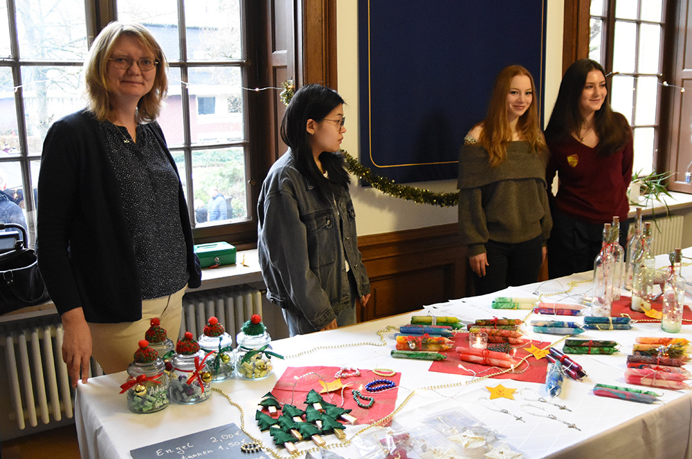 Im Schloss eröffnete sich den Besuchern anschließend das bunte Panorama des Adventsbasars: Kreative Basteleien wie Karten, Adventskalender, Teelichthalter, köstliches Selbstgebackenes, praktische Weihnachtsgeschenke wie Lesekissen und Taschen, Vogelhäuschen und Meisenknödelhalter aus Weiden – wie immer hatten Eltern und Kinder Arbeit und Herzblut investiert, um das Angebot attraktiv zu gestalten. Auch für das leibliche Wohl war gesorgt: In der Cafeteria konnte man sich mit Torten und Kuchen stärken, während draußen vor dem Schloss in der Jurte Glühwein, Kakao, Punsch, Popcorn, Zuckerwatte und Waffeln angeboten wurden. Die heimelige Stimmung hier lud besonders zum Verweilen und "Klönen" ein.