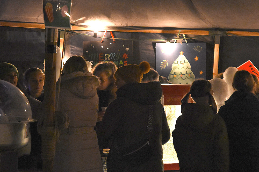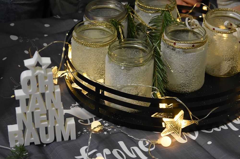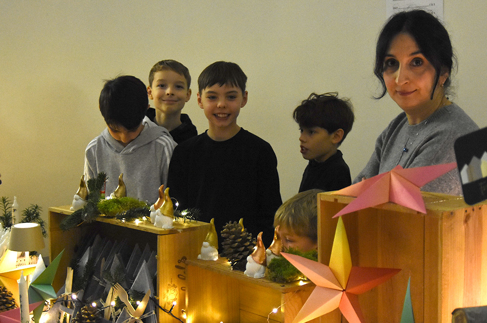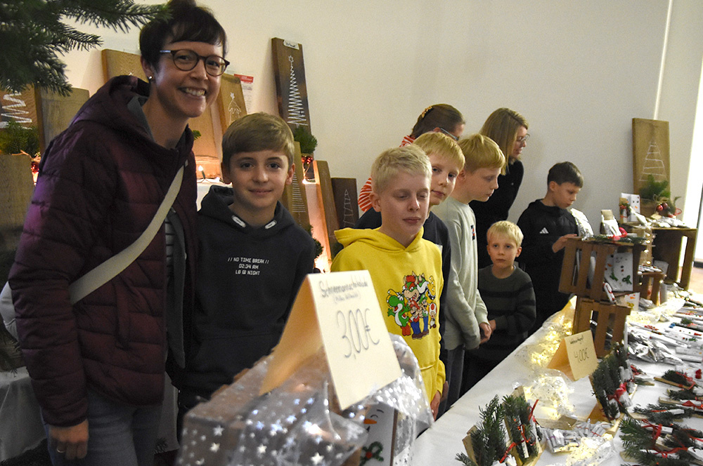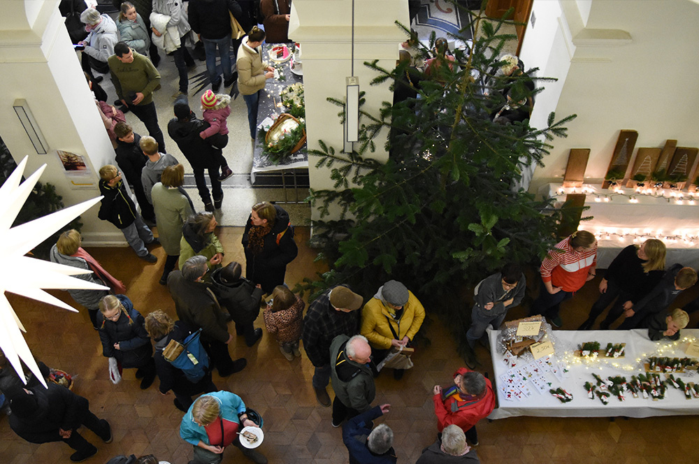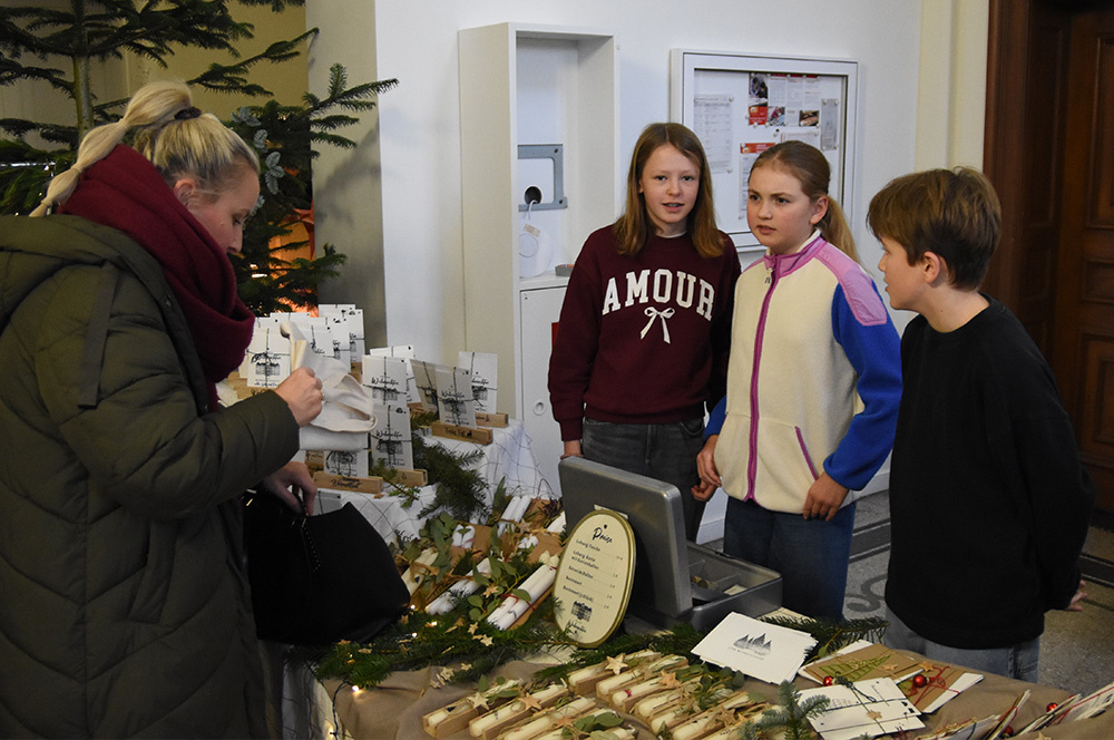 Im Schloss eröffnete sich den Besuchern anschließend das bunte Panorama des Adventsbasars: Kreative Basteleien wie Karten, Adventskalender, Teelichthalter, köstliches Selbstgebackenes, praktische Weihnachtsgeschenke wie Lesekissen und Taschen, Vogelhäuschen und Meisenknödelhalter aus Weiden – wie immer hatten Eltern und Kinder Arbeit und Herzblut investiert, um das Angebot attraktiv zu gestalten. Auch für das leibliche Wohl war gesorgt: In der Cafeteria konnte man sich mit Torten und Kuchen stärken, während draußen vor dem Schloss in der Jurte Glühwein, Kakao, Punsch, Popcorn, Zuckerwatte und Waffeln angeboten wurden. Die heimelige Stimmung hier lud besonders zum Verweilen und "Klönen" ein.