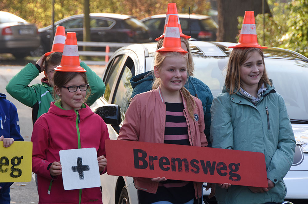 In der vierten Stunde hatten die Schülerinnen und Schüler bei schönstem Wetter die Gelegenheit, reale Verkehrssituationen handlungsorientiert zu erleben. Die Kinder lernten vor allem durch praktische Übungen und Demonstrationen. Sie erlebten den Zusammenhang zwischen Geschwindigkeit, Reaktionszeit und Bremsweg, auch in Abhängigkeit von verschiedenen Fahrbahnzuständen, und konnten so den Anhalteweg von Fußgängern und Fahrzeugen besser einschätzen.