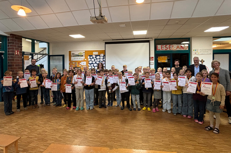 Das traditionelle Herbstsingen an der FvA-Schule, an dem auch viel Eltern teilnahmen, hatte für einen wunderbaren feierlichen Rahmen mit vielen kleinen musikalischen Darbietungen gesorgt. Alle 49 SchülerInnen der erfolgreichen 4.Klassen erhielten darüber hinaus jeweils eine Siegerurkunde und eine Medaille für ihre großartigen Leistungen.