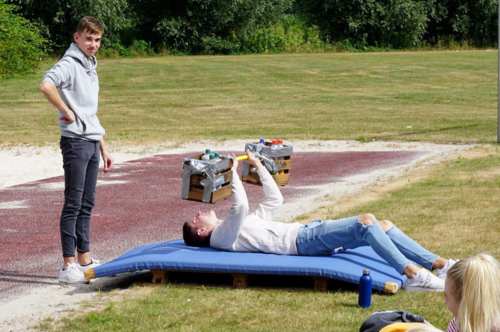 Es werden aus Alltagsmaterialien Sportgeräte (Hanteln aus Flaschen, Wackelbretter etc.) entwickelt und selbst ausgetestet.