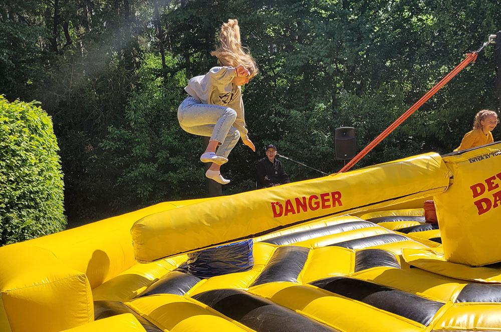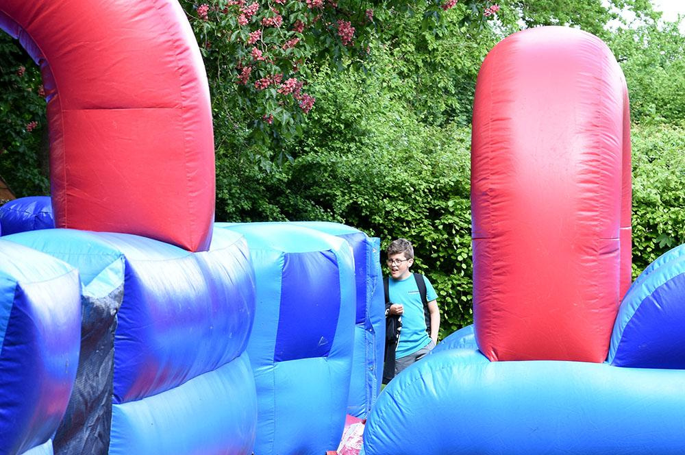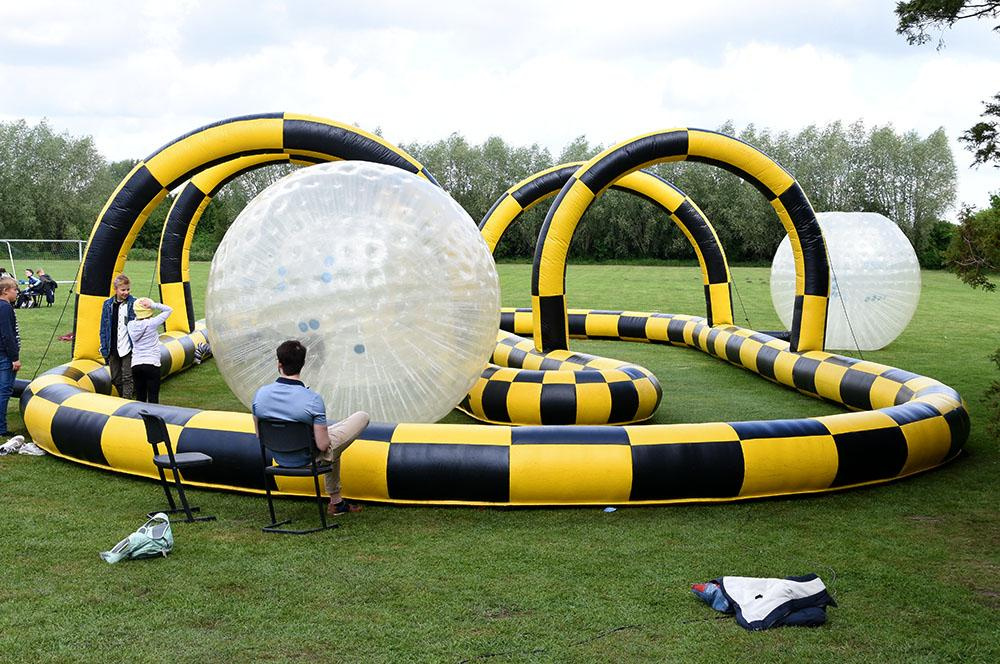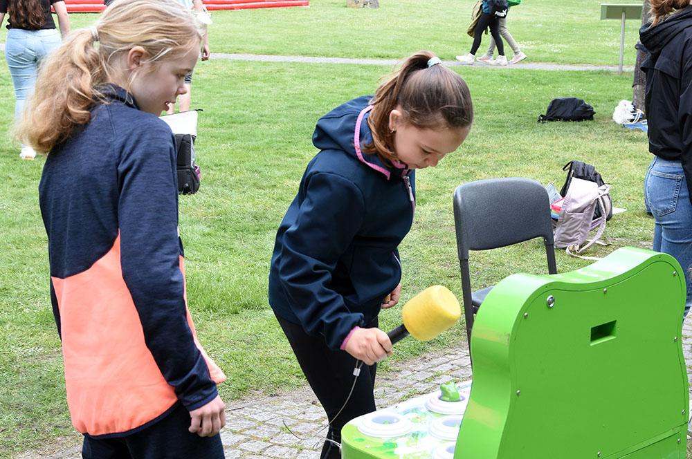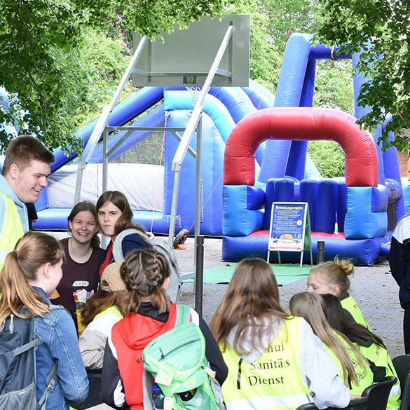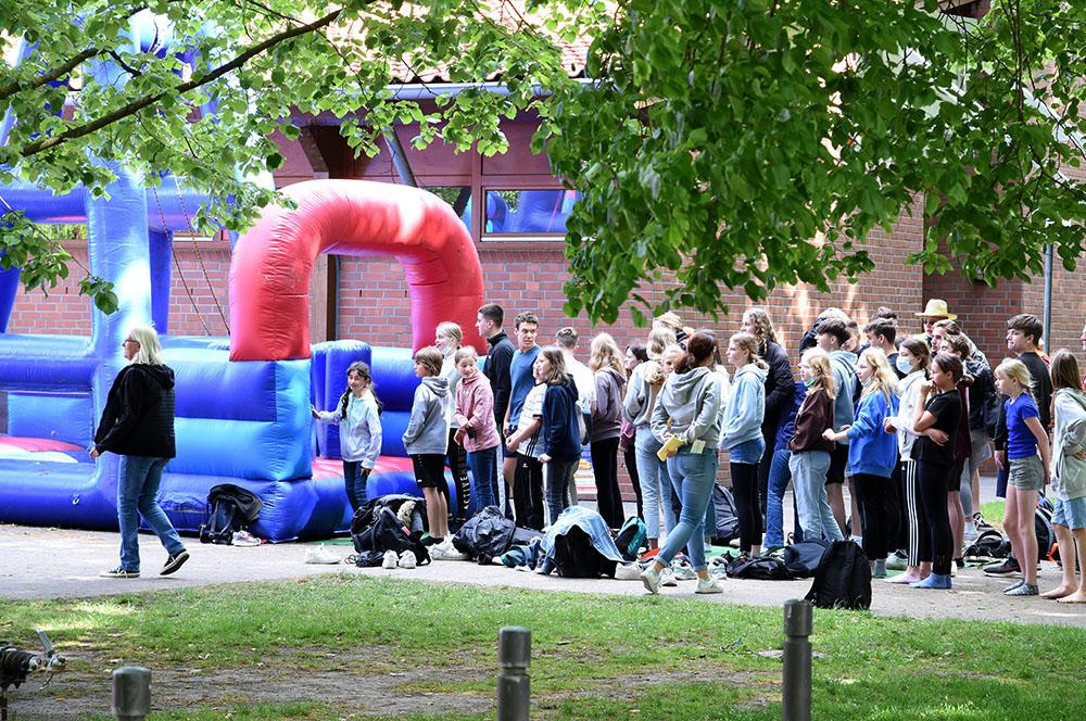 Das erklärte Ziel des Teamtages, der von der Schülervertretung angeregt und maßgeblich organisiert worden war, bestand darin, nach mehr als zwei Jahren mit Corona den Teamgeist der Schüler*innen zu stärken. Um dies zu erreichen, traten die Teams, die zwischen 16 und 20 Spieler*innen umfassten, an den verschiedenen Stationen gegeneinander an. Dabei ging es aber nicht primär darum, unbedingt als Sieger hervorgehen zu wollen, sondern darum, sich gemeinsam den jeweiligen Herausforderungen zu stellen. Zu den Attraktionen gehörten sowohl weitverbreitete Spiele wie „Vier gewinnt“, „Hau den Lukas“ oder Tischkicker, die hier allerdings in Großformat zum Einsatz kamen, als auch eher unbekannte Spiele wie etwa der „Sorbing Ball Run“, bei dem die Herausforderung darin besteht, in einem aufblasbaren transparenten Ball einen Rundkurs zu durchlaufen.