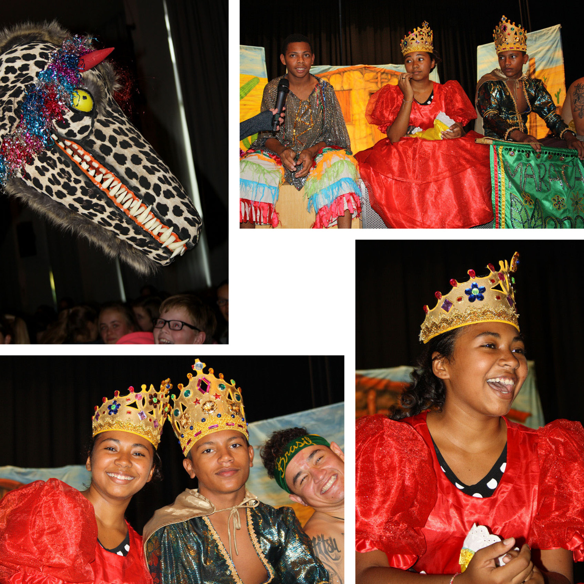 Im zweiten Teil der Aufführung zeigte sich die brasilianische Lebensfreude. Tänze aus den verschiedenen Epochen kamen in einem zum Teil rasanten Tempo auf die Bühne und diese Freude schwappte auf die jungen Zuschauer aus Deutschland über. Capoeira, der Tanz der Sklaven mit dem sie ihr Kampftraining kaschierten, Samba, Salsa und Maracatu mit akrobatischen Einlagen führten zu Beifall bei den Schülern und spornten die jungen Künstler an. Besonders das Fabelwesen, eine Mischung aus Krokodil, Giraffe und Gepard, begeisterte die Schüler. So erhielten die Schüler einen guten Einblick in das Leben dieses Landes der Kontraste, das vielen nur aus dem Karneval in Rio und großen Sportereignissen bekannt ist.