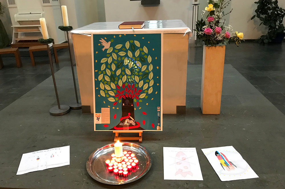 Am Freitag fand ein abschließendes Treffen in unserer Kirche statt: es wurden Gedanken zum Frieden vorgetragen, Kerzen entzündet, gesungen, Arbeiten der Schülerinnen und Schüler ausgestellt.