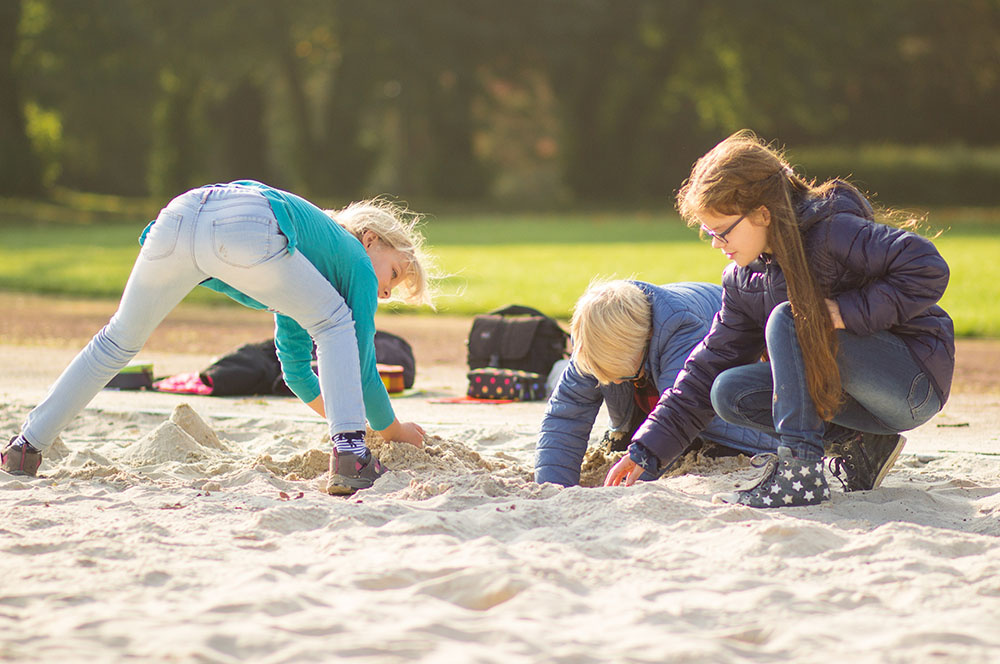 Eine dieser Methoden ist die Unterrichtseinheit ‚Von der Landschaft zur Karte‘. Die Schülerinnen und Schüler dürfen in Teams eine Landschaft im Volleyballfeld der Loburg erstellen. Die Kinder können hierbei ihrer Fantasie freien Lauf lassen, einzige Bedingung ist die Gestaltung von Hügeln innerhalb der selbstentworfenen Landschaft. So kommen die Kinder zu kreativen Elementen wie dem bunten Berg, der Elefantenwiese oder der berüchtigte Berg-City.