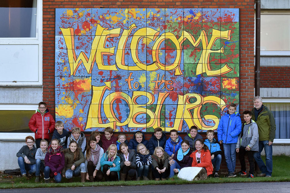 Wenn man auf das Gelände der Loburg fährt, wird man seit einigen Tagen von einem großen Willkommensschild empfangen. Schüler des Kunstprojektkurses der 6a und 6d haben das Graffitipuzzle in wochenlanger Arbeit erstellt. Zur Fertigstellung präsentierten sie sich zusammen mit ihrem Kunstlehrer Herrn Lunkebein vor ihrer Gemeinschaftsarbeit. Das Bild meint es ehrlich:" Welcome to the Loburg“.